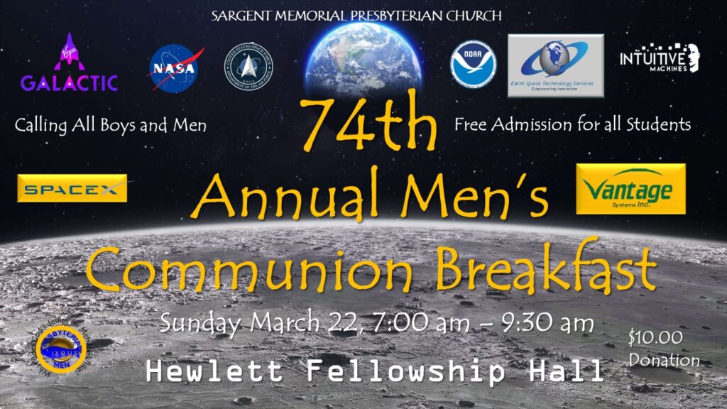 The Men’s Council of Sargent Memorial Presbyterian Church invites you to the 74th Annual Men’s Communion Breakfast on Sunday, March 22, 2026, from 7:00–9:30 AM in Hewlett Fellowship Hall.